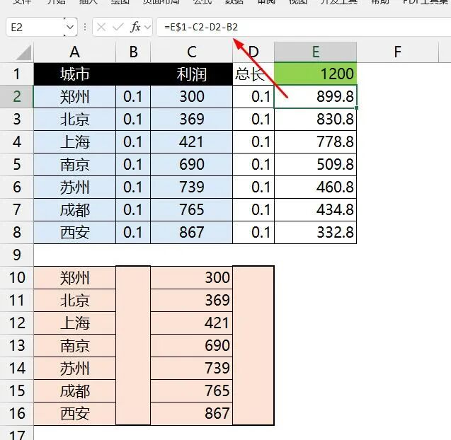 E 列中的公式 = 指定周长 - B:D 列中的值